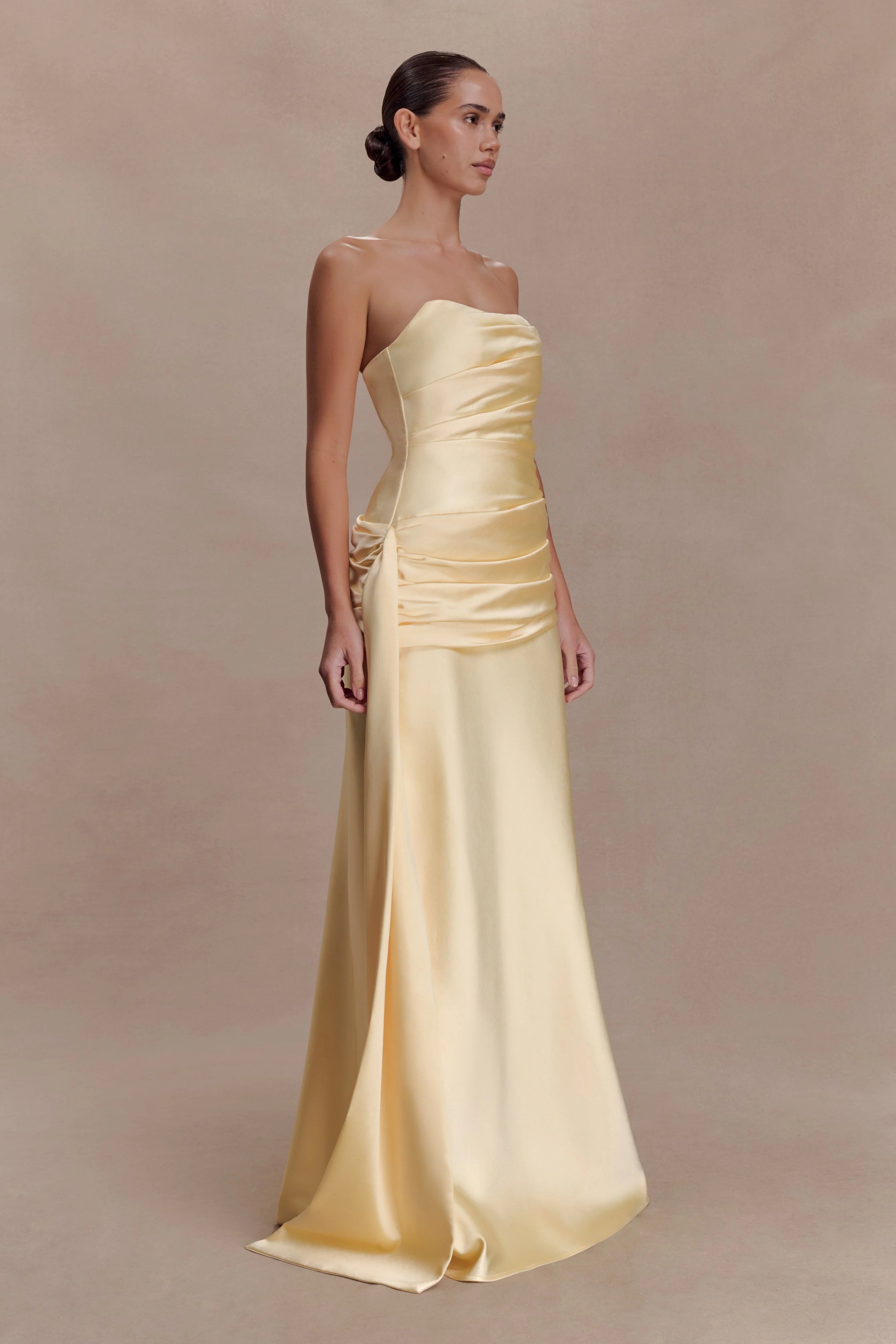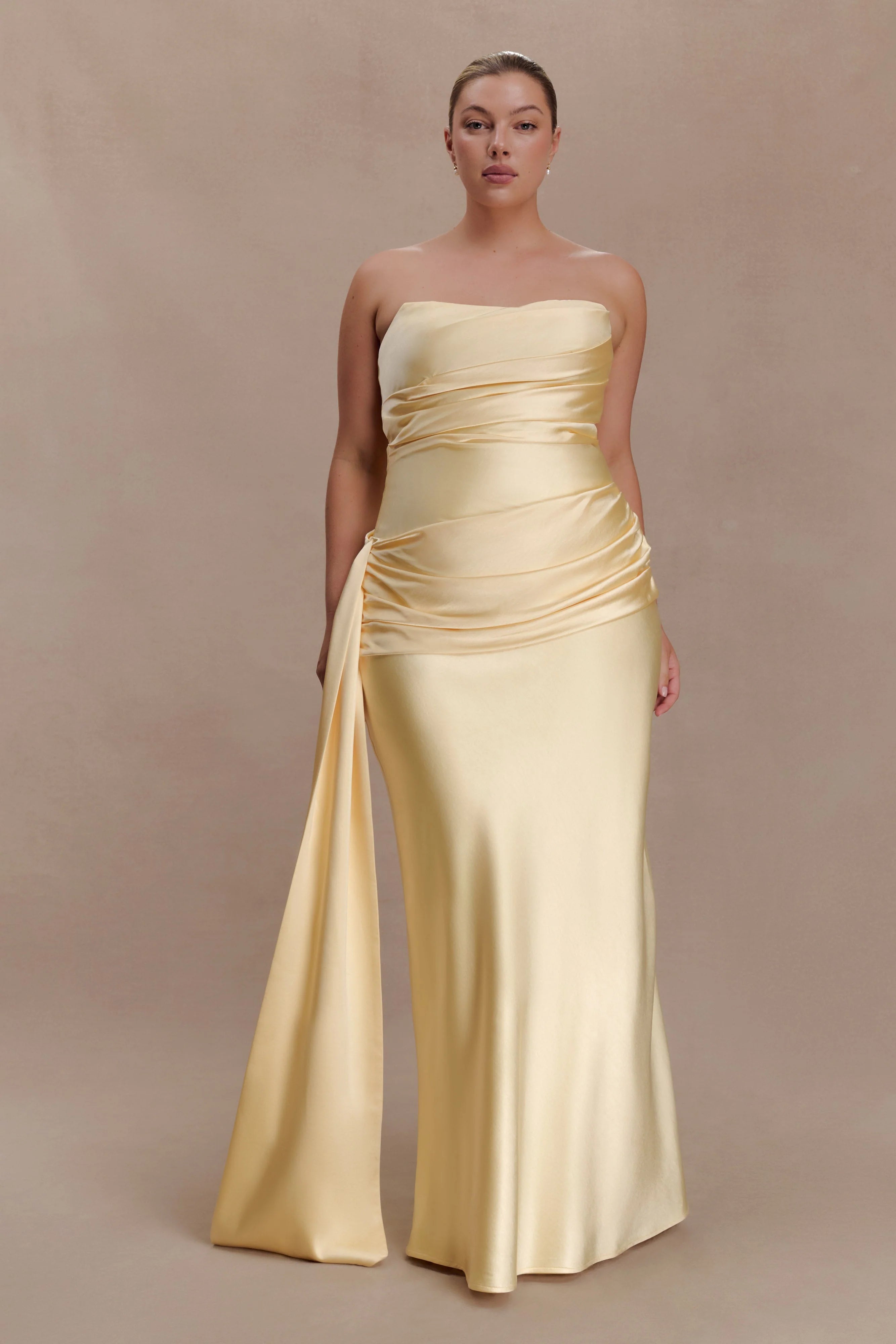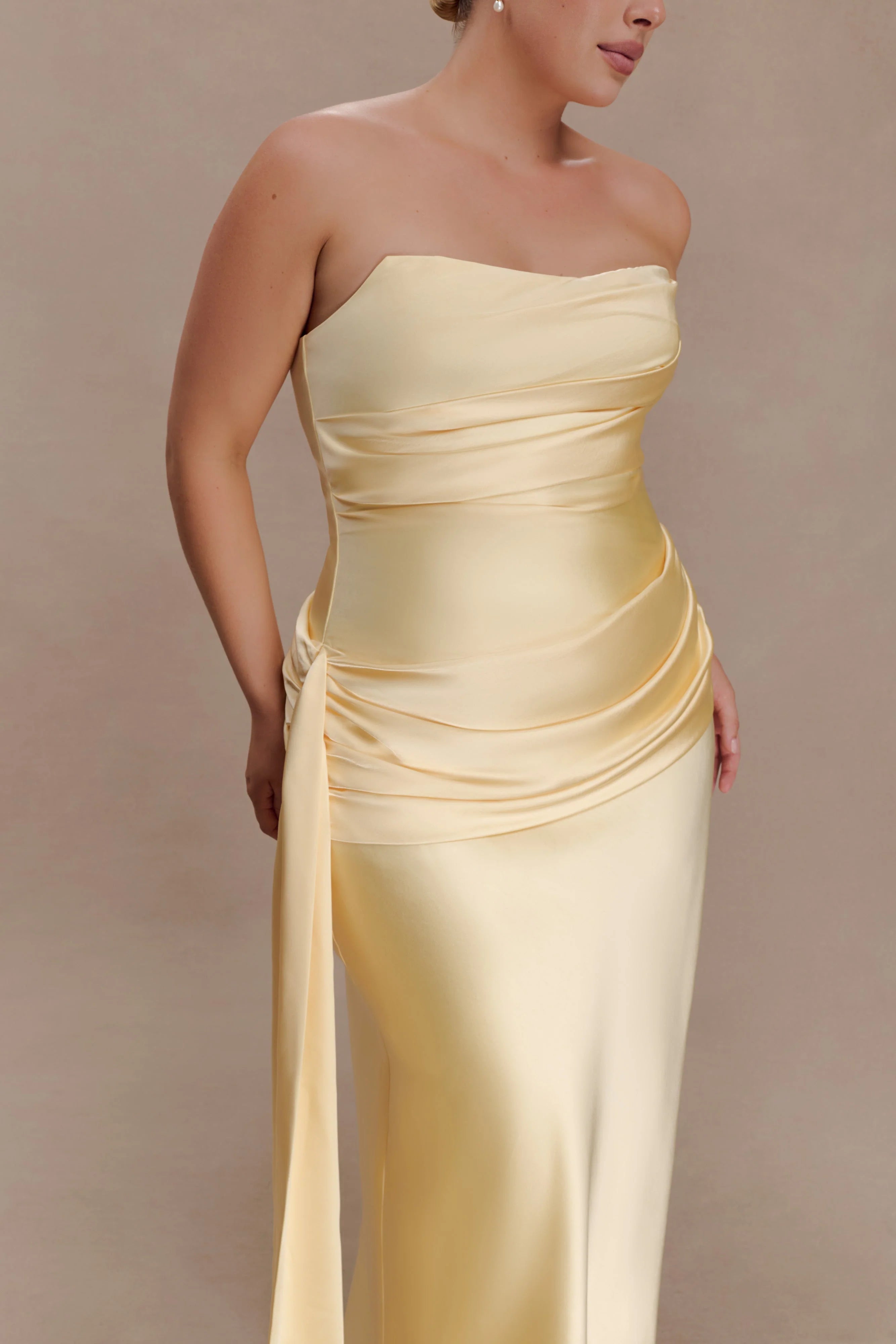 The SARAH Strapless Maxi Dress With Waist Tie is designed to sculpt with intention while maintaining effortless movement. Featuring a clean strapless neckline, it’s supported by an internal adjustable waist stay to ensure a secure, contoured fit. An asymmetric gathered waistband panel wraps the silhouette, finished with a long sash that drapes with soft drama. Fully lined for comfort and secured with an invisible side zip and hook-and-eye closure, this maxi-length design balances structure and flow — composed, confident, and made for moments that hold attention.