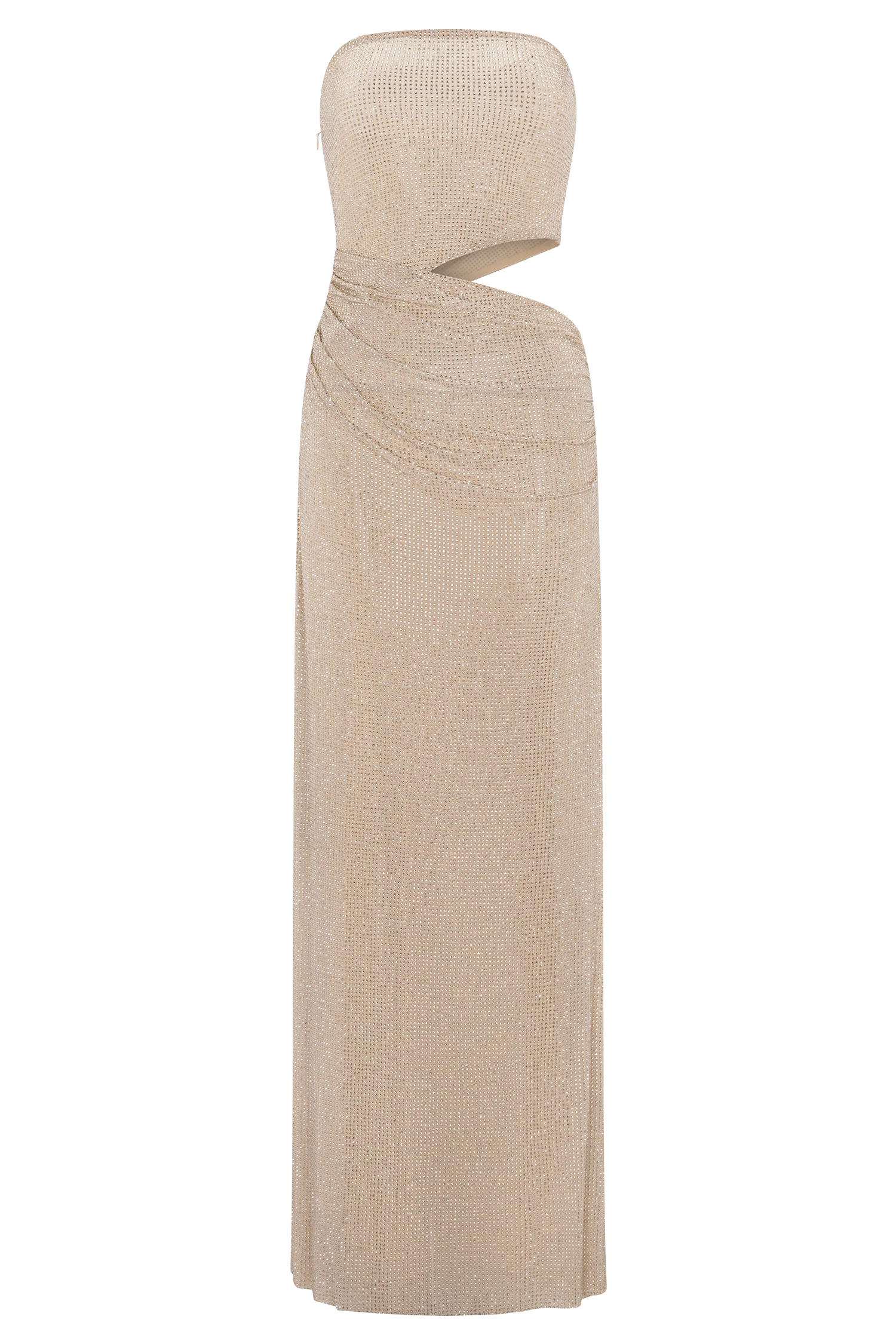 The STARLA Strapless Diamante Maxi Dress is crafted for sophistication that commands attention. Designed with a straight strapless neckline and a sleek fitted bodice, it features a subtle waist cut-out that accentuates the silhouette while adding a touch of allure. The straight skirt falls effortlessly to a maxi length, creating a clean, elongating line. Fully lined and complete with a side zip closure for a seamless fit, this dress captures refined glamour with a modern twist.