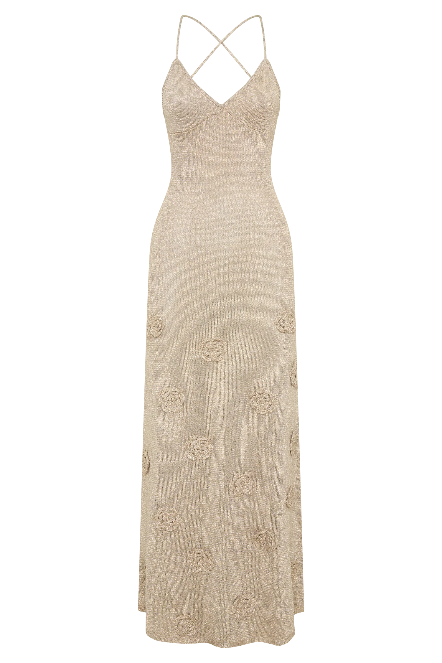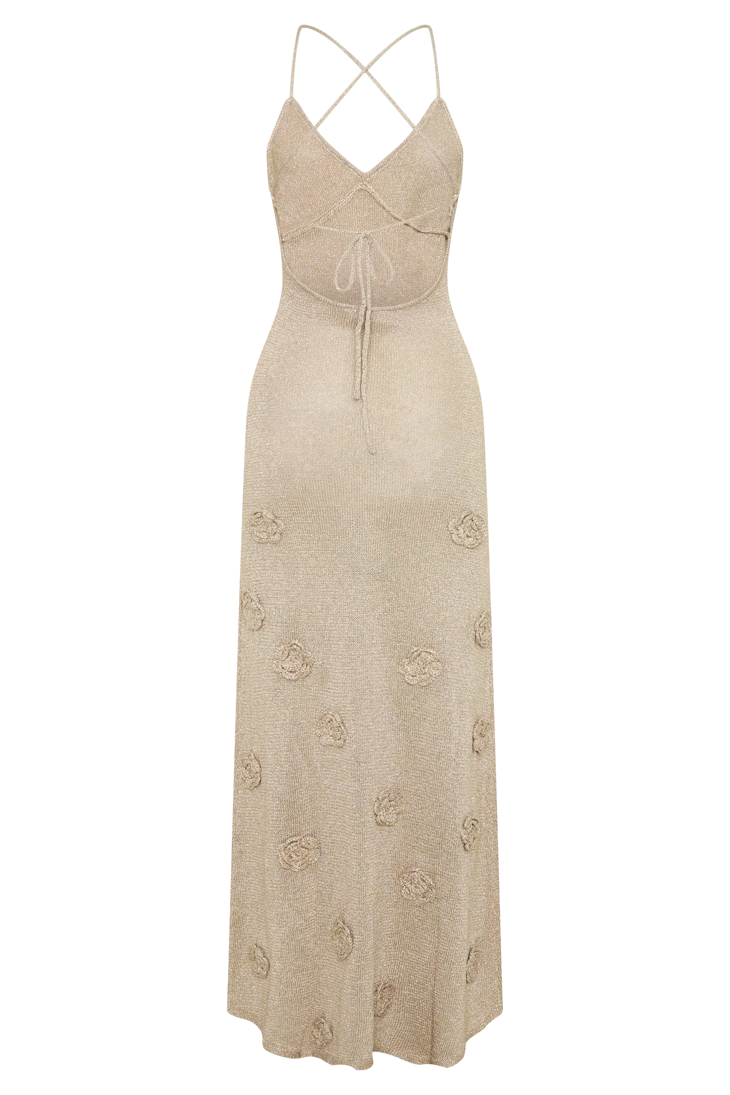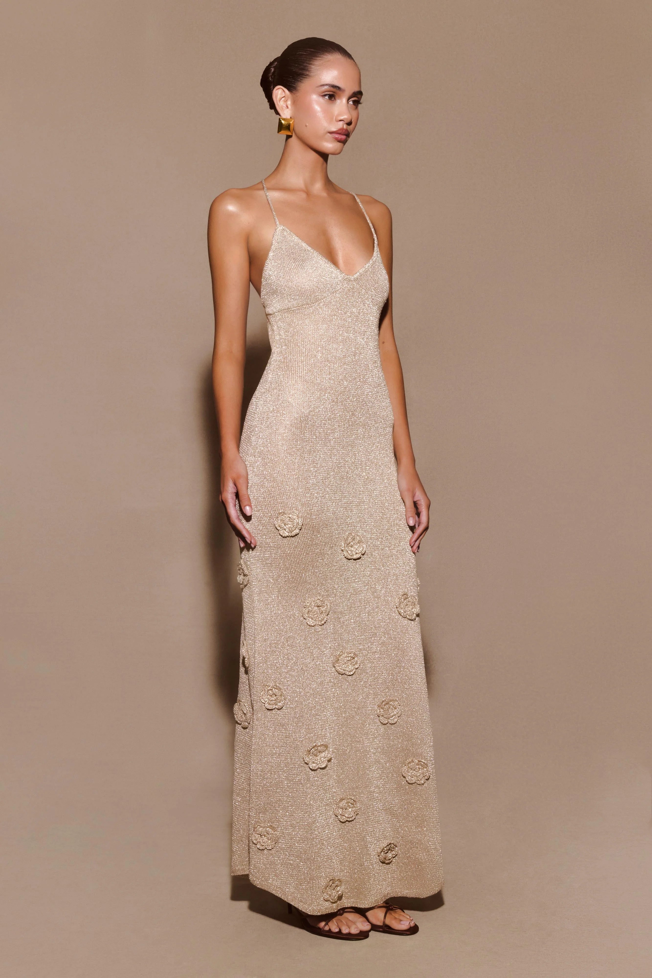 The SUKI Crochet Maxi Dress with Flowers features a V neckline and crisscross functional straps, exuding sophistication and grace. Its bodycon silhouette accentuates curves, while delicate flower appliqué adds a whimsical touch. Crafted from unlined knitwear, it offers comfort and style for any occasion.