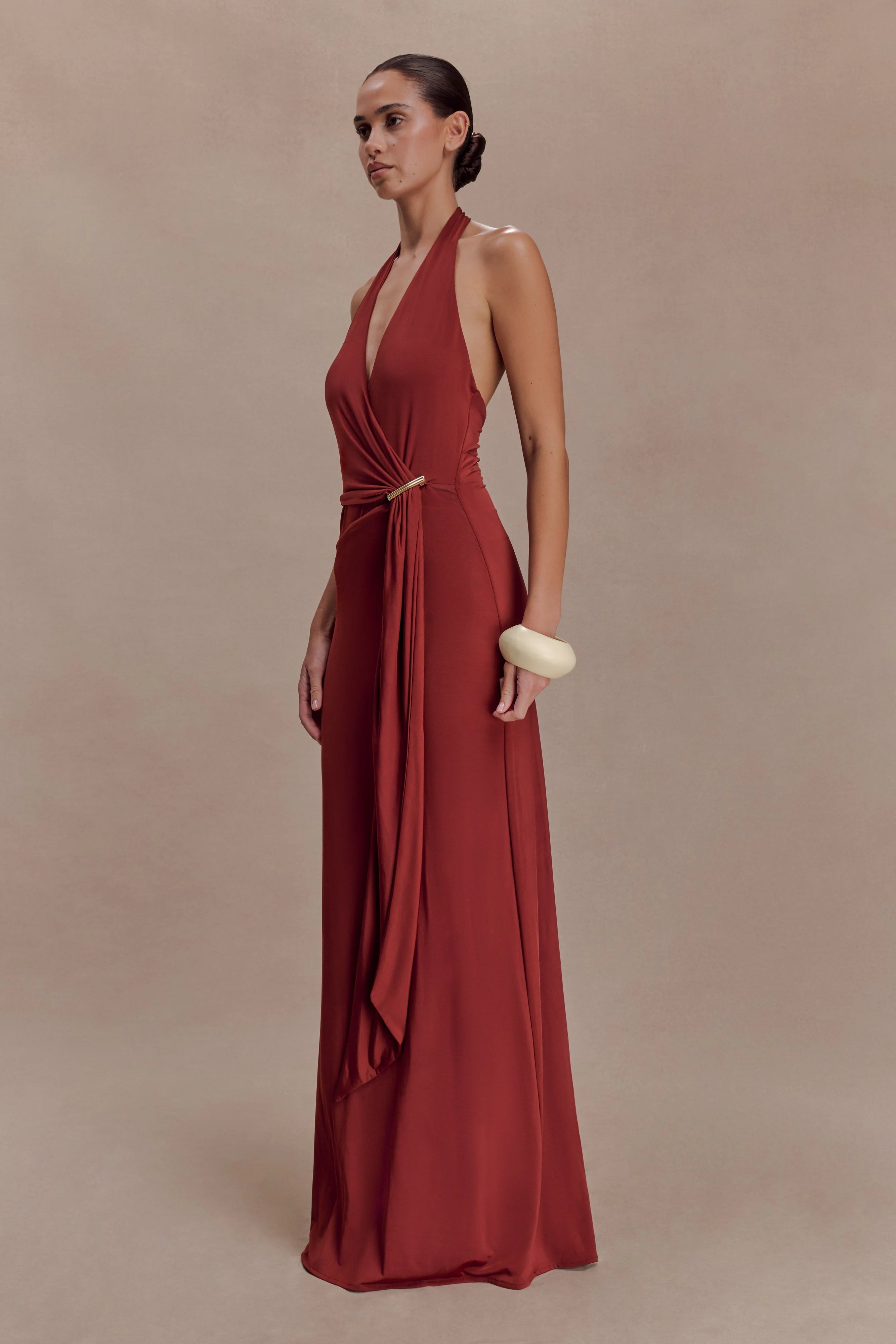 The VEDA Slinky Halter Maxi Dress is designed to contour with confident precision. Featuring a halter V neckline secured with a back button closure, it frames the shoulders while revealing a striking open back. A sculptural hardware detail at the waist defines the silhouette, drawing focus to the fitted bodycon shape. Fully lined for comfort and falling to a sleek maxi length, this design balances fluid movement with deliberate structure — modern, minimal, and made to command attention.
