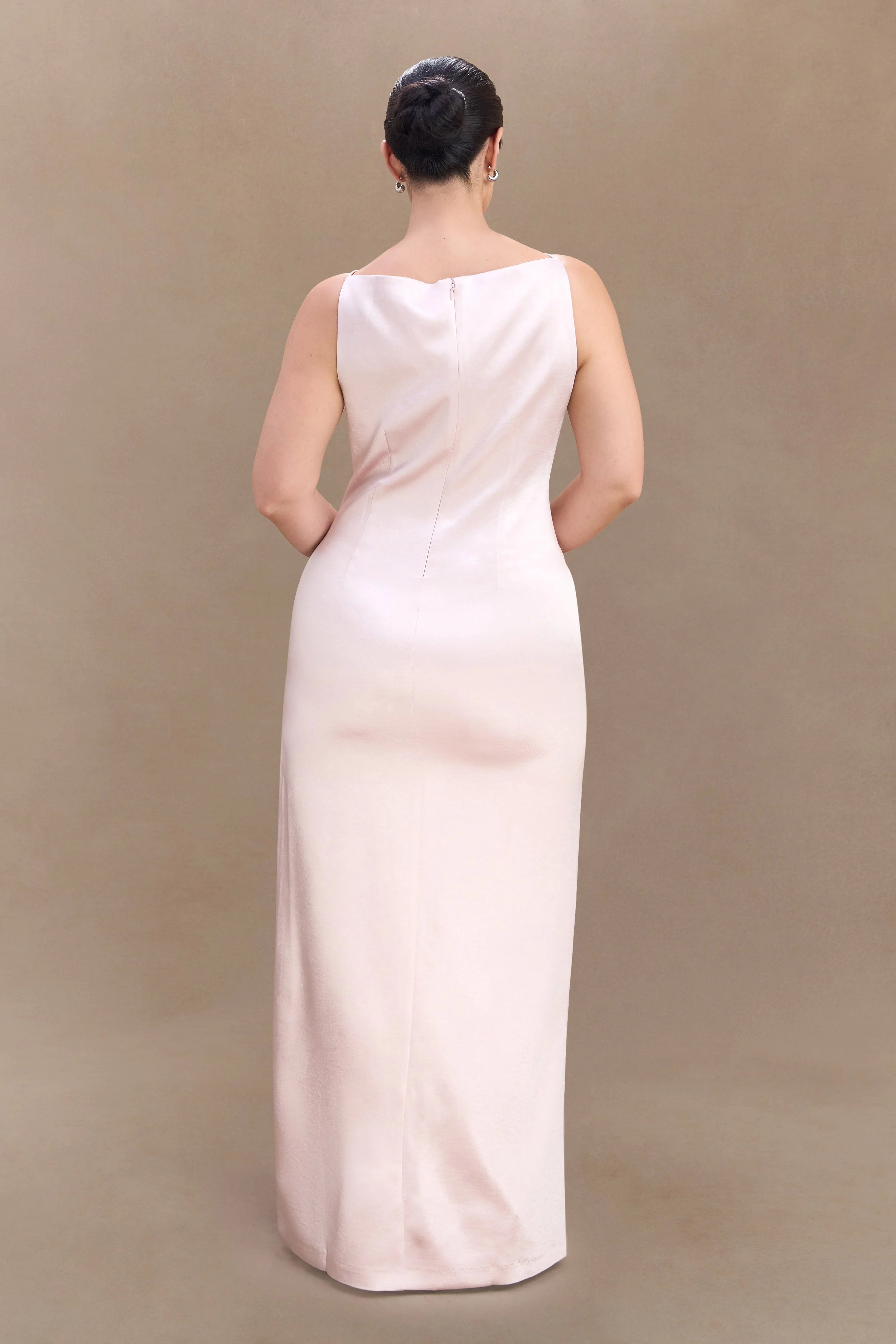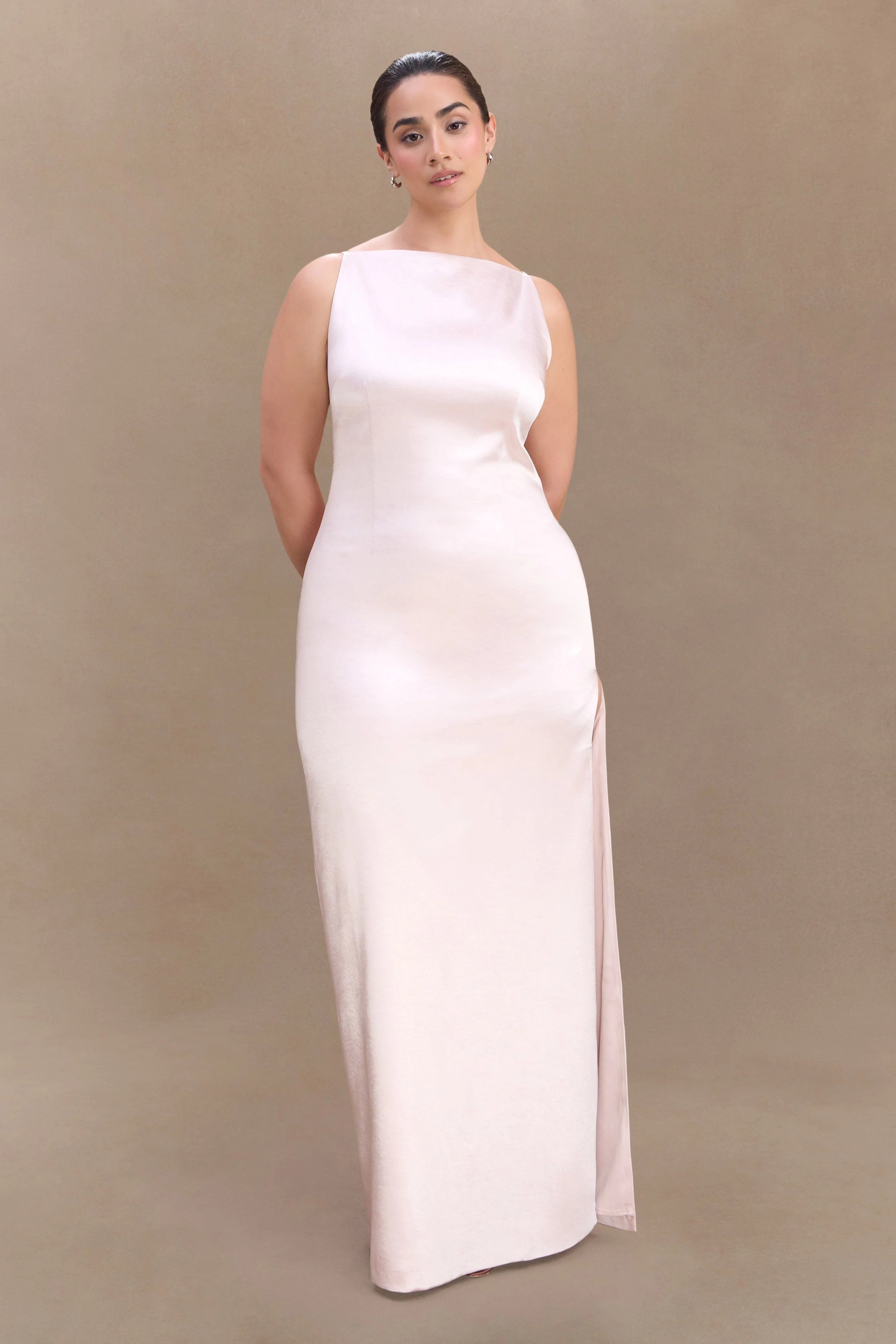 The VIOLET Sleeveless Satin Maxi Dress is the epitome of understated glamour. Designed with a sleek, fitted bodice that contours the frame, this silhouette flows effortlessly into a straight-cut skirt for a refined finish. A side leg split adds a touch of allure, creating movement with every step. Finished with a discreet back zip for a seamless fit, this dress is perfect for elegant soirées, formal occasions, or modern bridal celebrations.