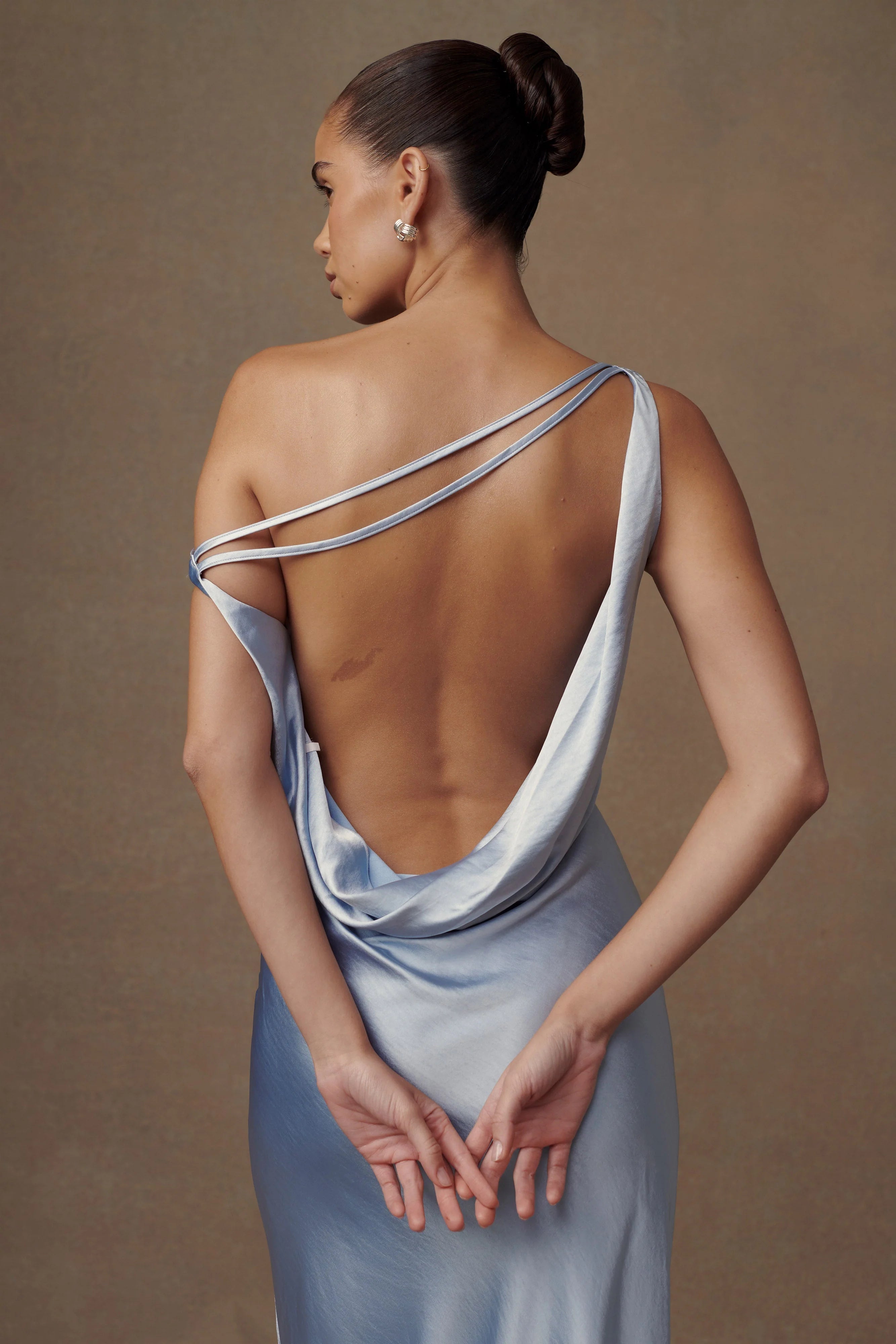YVETTE is a Slip Maxi Dress with a low, open back, a slight cowl detail for the front neckline, and a loose, flowing hem. The front neckline dips into a slanted arrangement, with one shoulder strap up for a sleeveless look and the other down in an off-shoulder style. The asymmetrical hem is much the same, with one part gathered above the ankle and the other hitting the ground. Two thin fabric straps run across the back, adding extra detail to the low, back neckline.